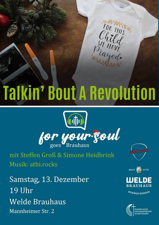 Am Samstag, 13. Dezember, ab 19 Uhr gibt es im Welde Brauhaus (Mannheimer Straße 2, Schwetzingen) die nächste Ausgabe von for your soul – dem Gottesdienst-Format, das in entspannter Kneipen-Atmosphäre Popmusik, alltagsnahe Sprache und Theologie verbindet.