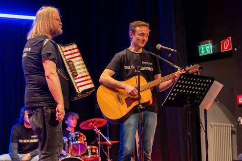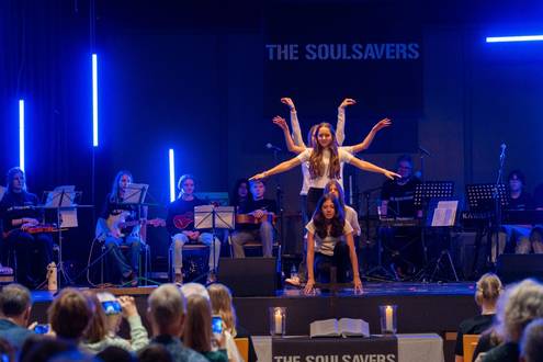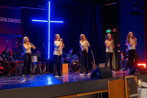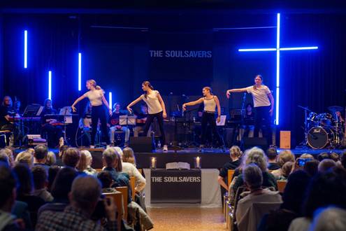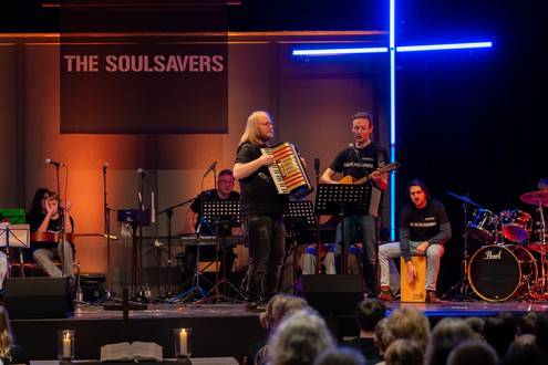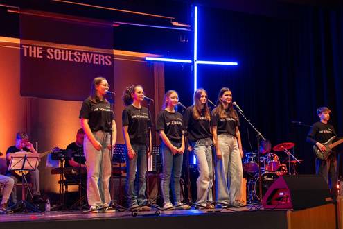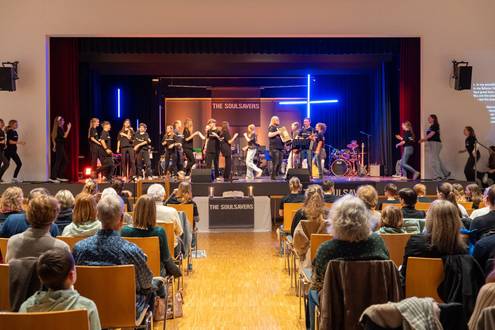 Der Vorhang ist noch geschlossen, da erklingen bereits die ersten Töne: Horn, Klavier, Schlagzeug. Dann öffnet sich der Vorhang – und sie stehen da: die SoulSavers, die Konfirmandinnen und Konfirmanden des aktuellen Jahrgangs. - Die One Night with the SoulSavers beginnt.