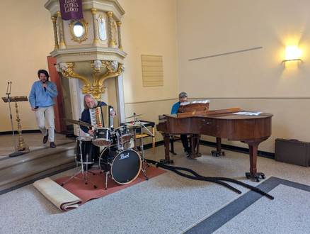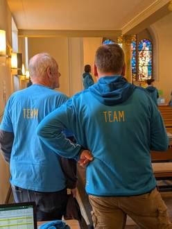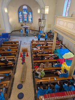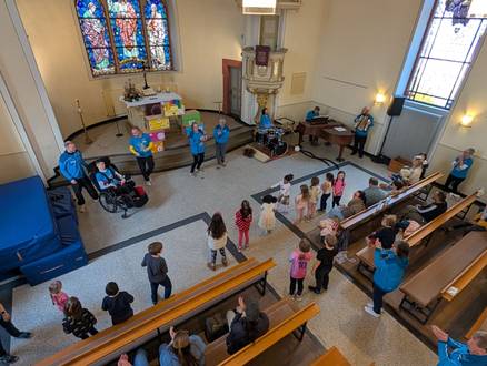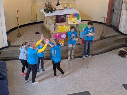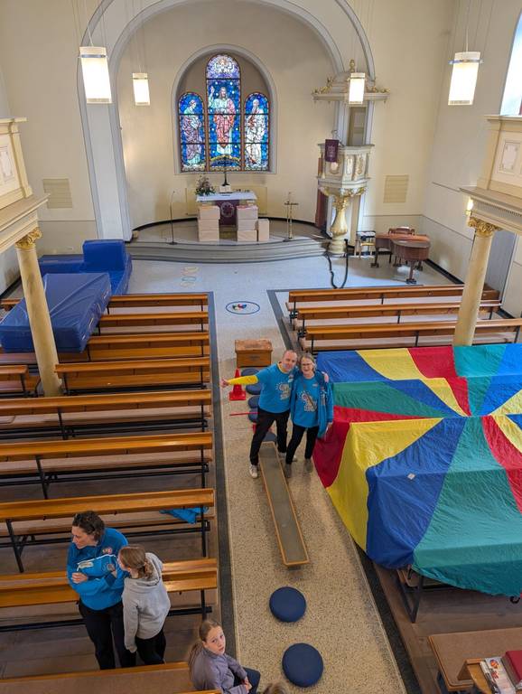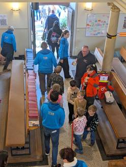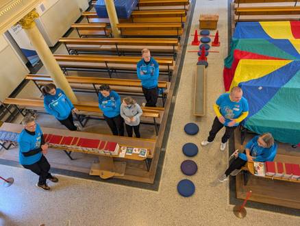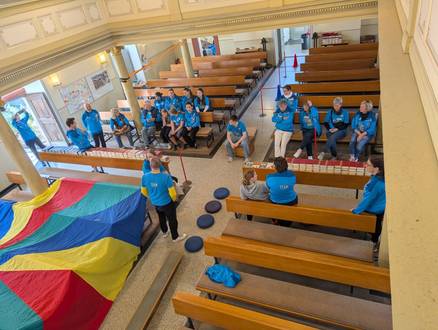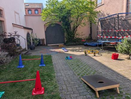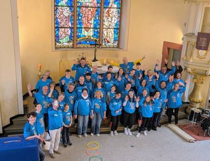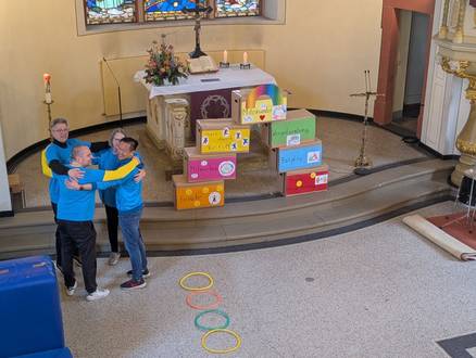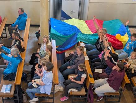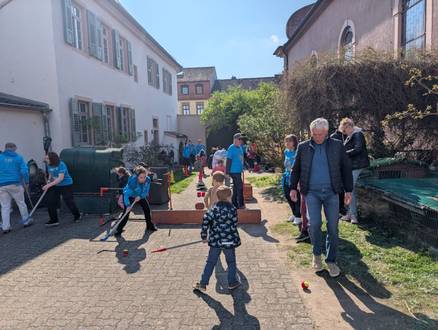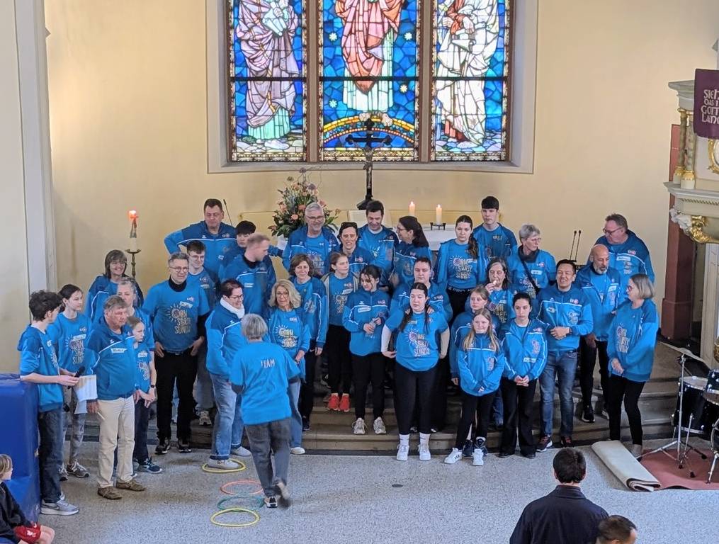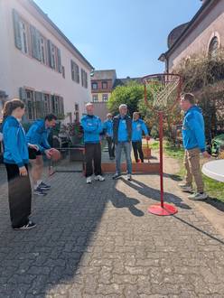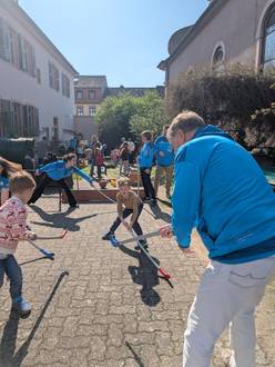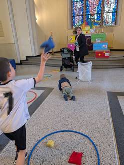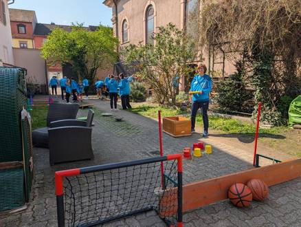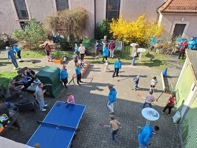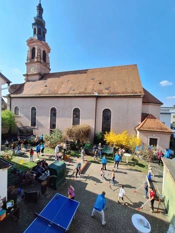 Als dann die eigens zusammengestellte Band um Kantor Paul Hafner (Schlagzeug), Steffen Groß (Klavier) und Torsten Hämmerle (Akkordeon) auch noch den Karnevalshit „Gute Laune“ anstimmte, wurde in der Kirche lautstark mitgesungen und ausgelassen getanzt – und dann ging es los mit dem aktiven Sport- und Spielprogramm: Ob Basketball am großen Pfarrhoftor, Hockeyspielen im Schatten des Kirchturmes, ein Geschicklichkeitsparcours im Mittelgang der Kirche oder eine Matte, die quer über die Kirchenbänke gelegt war und zum Turnen einlud – überall gab es sportliche Mitmach-Aktionen und strahlende Gesichter. Dazu trug auch der gemütliche „Familien-Treff“ mit einem frühlingshaften Open-Air-Café zum Entspannen im sonnigen Pfarrhof dabei.