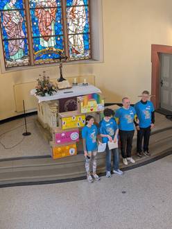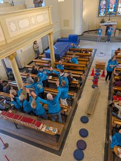 Los ging es mit einer kleinen Andacht zum aktiven Mitmachen: „Wir bauen Brücken“, hieß das erste Lied, und genau das taten Jens Rückert, Mitbegründer und Projektleiter des OPEN SPORTY SUNDAY, und Steffi Schmidt von der Kirchengemeinde dann auch. Auf Pappkartons waren die Werte aufgeschrieben, die den TV Schwetzingen 1864 und die Kirche verbinden: Freude, Mitmachen, Vielfalt, Einsatz gegen Ausgrenzung, Fairplay und Verantwortung ergeben zusammen ein gelingendes Miteinander. Daraus entstand eine Brücke direkt vor dem Altar. „Seht, wie gut es ist und wie wohltuend wenn Menschen beisammen wohnen, als wären sie Bruder und Schwester“, zitierte Pfarrer Steffen Groß passenderweise den 133. Psalm aus der Bibel. „Genau so erleben wir das heute auch.“